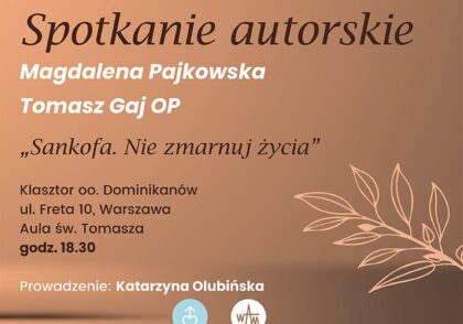 Zapraszamy na spotkanie autorskie wokół książki pt.: “Sankofa. Nie zmarnuj życia”. Spotkanie poprowadzi Katarzyna Olubińska. Wydarzenie odbędzie się w poniedziałek 26 maja o godzinie 18:30 w Klasztorze OO. Dominikanów , ul. Freta 10, Warszawa, aula św. Tomasza.